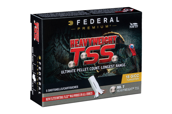 Kill gobblers at longer distances than ever before with HEAVYWEIGHT TSS. Its payload of HEAVYWEIGHT Tungsten Super Shot provides the highest pellet counts possibleup to double those of lead No. 5 loads of the same weight. The tungsten-alloy materials 18 gm/cc density is 22 percent higher than standard tungsten and 56 percent more than lead. The result is the most energy and highest velocities at extreme range. Its rear-braking FLITECONTROL FLEX wad performs flawlessly through ported and standard turkey chokes for the most consistent, deadly patterns possible.
