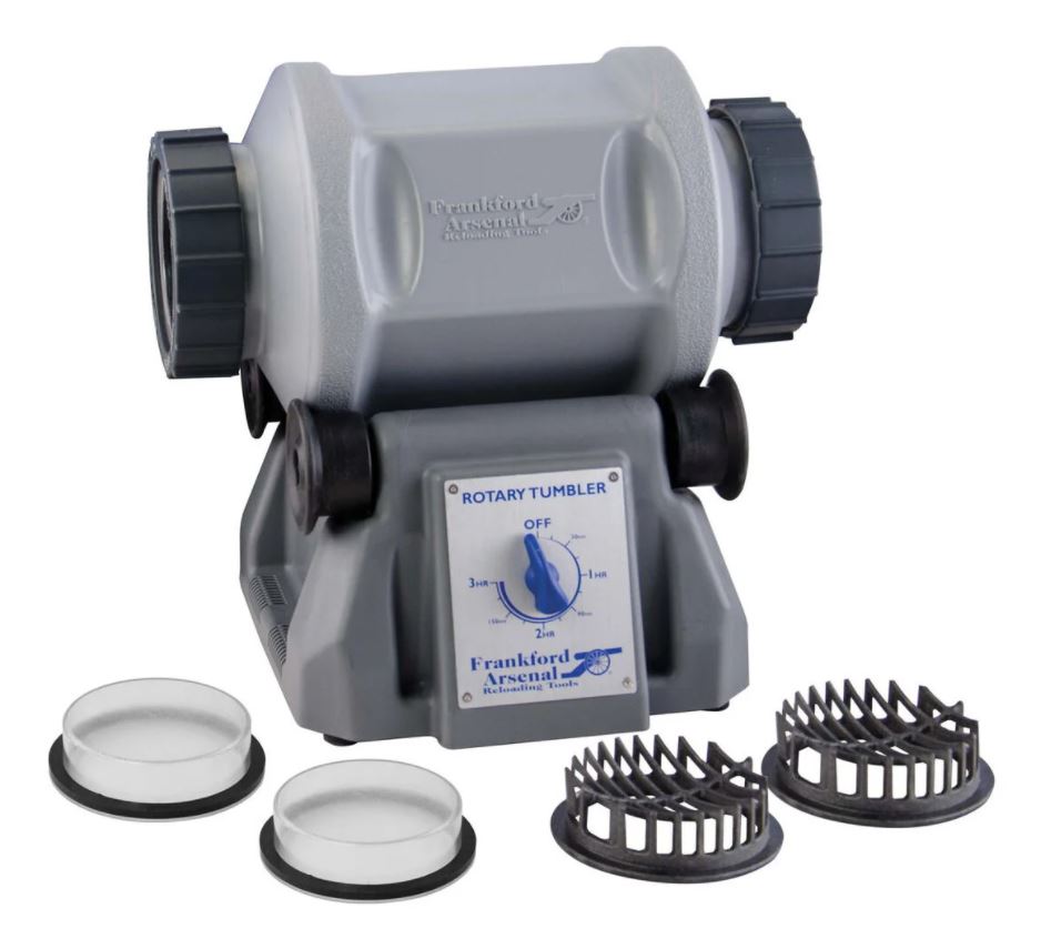 The Frankford ArsenalĀ® Platinum Series Rotary Tumbler delivers a whole new level of brass cleaning performance. When rotary tumbled with our stainless steel pins in a liquid bath, brass will get much cleaner and work much faster than ultrasonic or vibratory tumbling methods. The small stainless pins remove carbon from inside cases and primer pockets to deliver like new brass. The large volume drum holds up to 1000 pieces of.223 brass and has a molded-in rubber lining to protect brass and dampen noise during operation. A built-in timer in the base can be set to run from 0 to 3 hours shutting off automatically. A set of sifting end caps is also included to assist in separating the stainless media once tumbling is complete. The tumbler can effectively clean without the use of stainless media pins with a mixture of Frankford Brass Cleaning Solution and water (use of media pins ensures primer pockets and inside of cases are perfectly clean). Five pounds of 304 stainless media pins and a sample packet of Frankford Brass Cleaning Solution are included. It’s the most effective brass cleaning process available with a large 7 liter capacity.