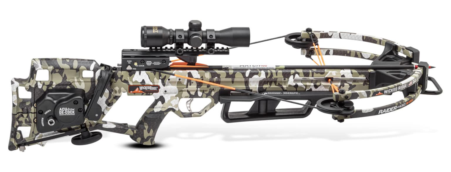 Equipped with the revolutionary ACU draw De-Cock for safe de-cocking, D1 Trigger, the American-Built Raider 400 De-Cock combines the convenience of safe de-cocking and speeds up to 400 feet-per-second to create an affordable crossbow for all hunters that outperforms its competitors.