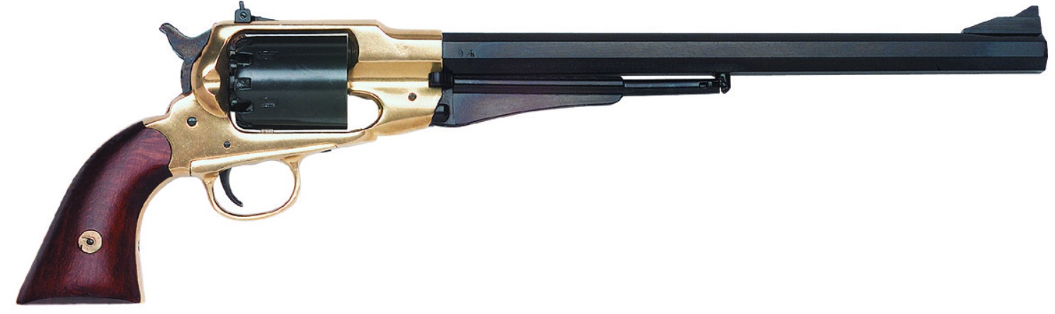 The 1858 New Army has a 12” ported octagonal barrel, brass trigger guard, blade front and notch rear sights. This percussion revolver has a comfortably rounded trigger guard and an authentic fixed blade and wedge front sight, while the “V” type notch in the hammer gives adequate light for quick target sight alignment. It is also equipped with mechanically perfect hand inspected action, solid frame, precise tolerances, and classic blued finish.